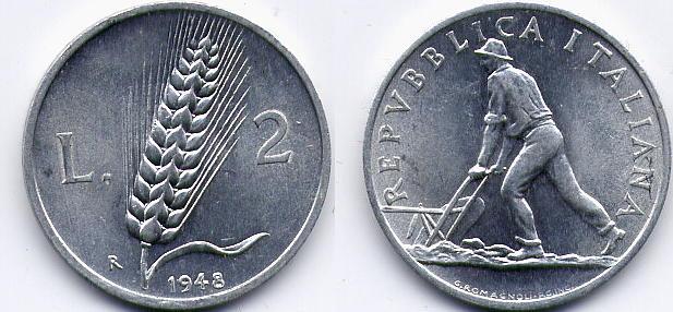 Repubblica Italiana (dal 1946): 2 lire 1948 "Spiga" (Gigante#326)