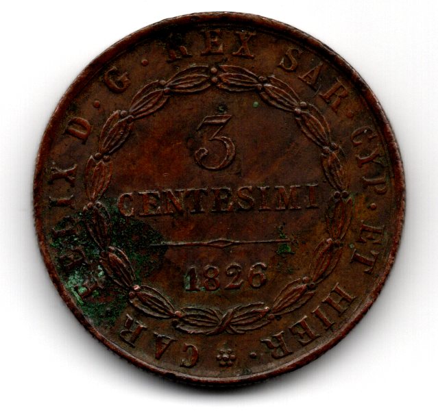 Carlo Alberto (1831-1849): 3 centesimi 1826-To (Gigante#110)