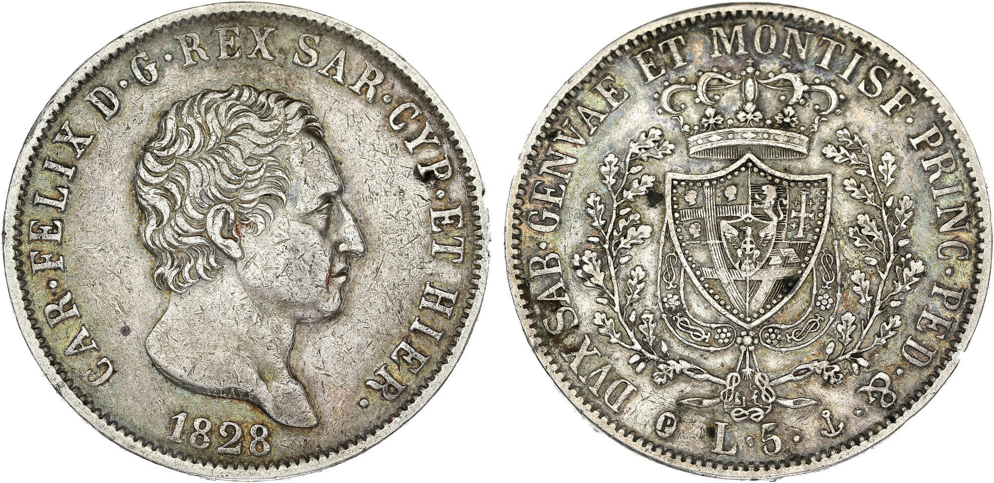 Carlo Felice (1821-1831): 5 lire 1828-Ge (Gigante#47)