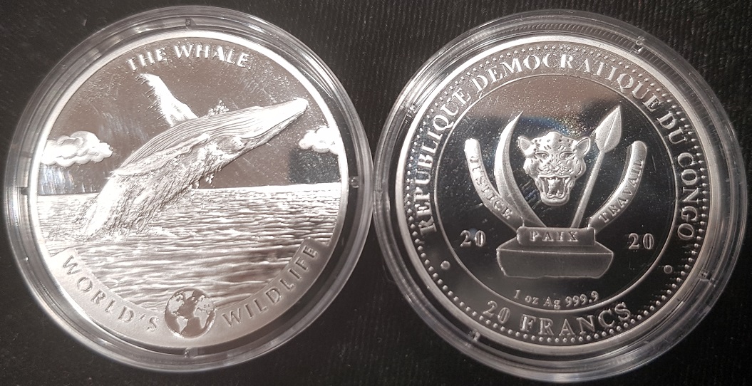 Congo: 20 franchi 2020 "Balena - World Wildlife: The Whale", oncia in argento