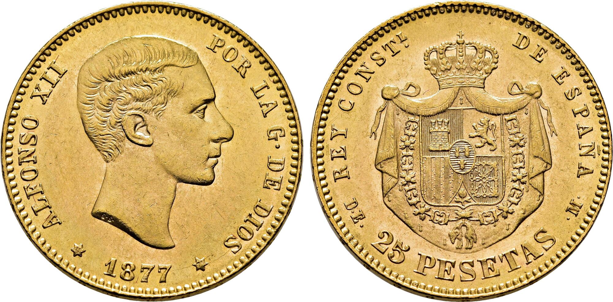 Spagna, Alfonso XII (1874-1885): 25 pesetas 1877 (77) (Cayon#17525), grammi 8.04