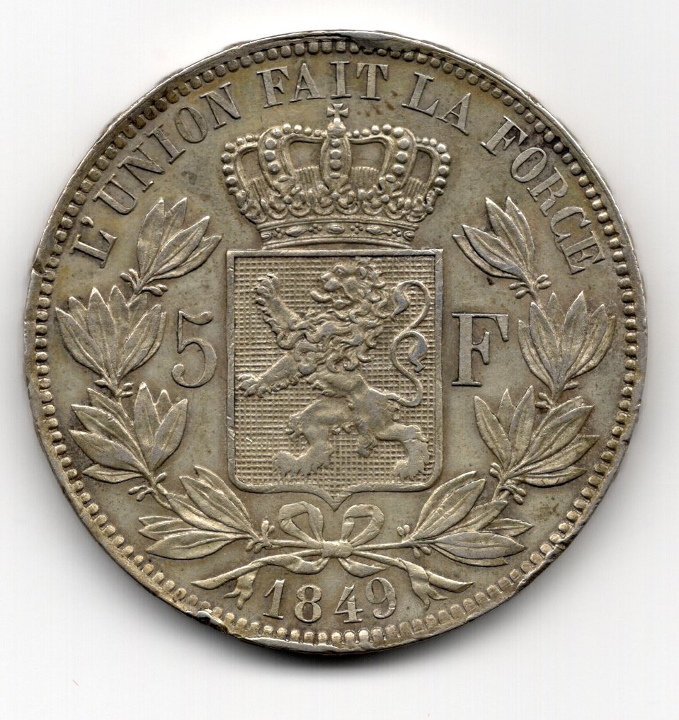 Belgio, Leopoldo I (1831-1865): 5 franchi 1849
