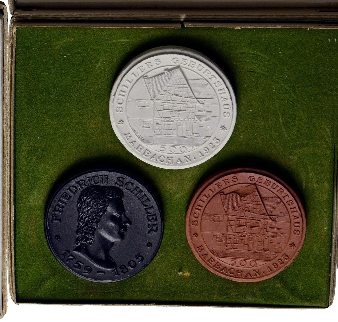 Germania, Repubblica di Weimar: 1923 set di tre medaglie in porcellana coniate a Marbach, "Schiller-Verein", nella confezione originale