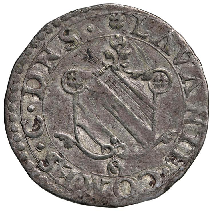 Messerano, Pier Luca II Fieschi (1528-1548): muragliola (MIR#717), grammi 1.91. Nominale di rarissima apparizione, un solo passaggio in asta negli ultimi 20 anni