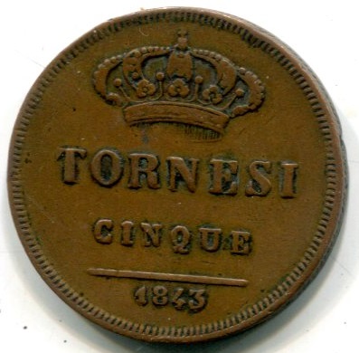Napoli, Ferdinando II (1830-1859): 5 tornesi 1843 (Gigante#220)