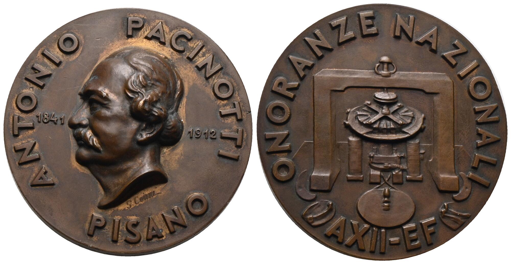 Pacinotti Antonio (1841-1912): medaglia 1912 "ONORANZE NAZIONALI AXII-EF", opus Barlacchi (FI), grammi 146,33