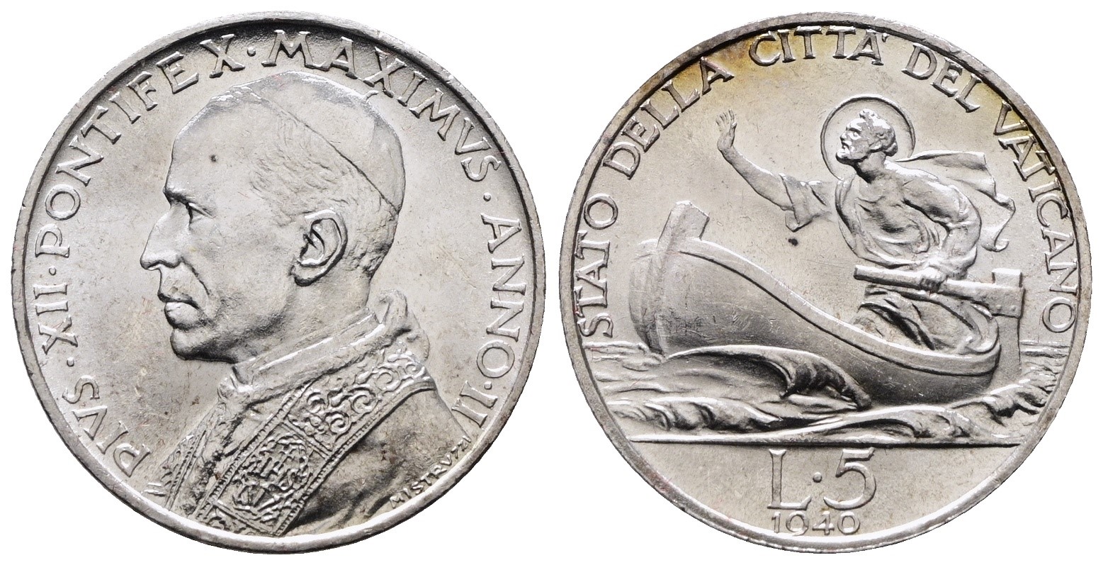Vaticano, Pio XII (1939-1958): 5 lire 1940-II (Gigante#147), conservazione eccezionale