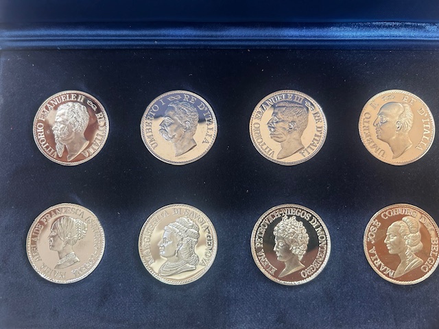 Savoia: scatola contenente otto medaglie commemorative di quattro regnanti con le relative mogli. Grammi 159.20/925°°