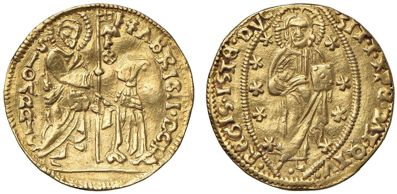 Rodi, Cavalieri di San Giovanni, Fabrizio del Carretto (43° Gran Maestro 1513-1521): ducato in oro ad imitazione di quello veneziano (Schlumberger, tav.XIV#14; Friedberg#11; Gamberini#386; Kasdagli#R18/5; Ives#type E), grammi 3.47
