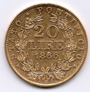 Roma, Pio IX (1846-1870): 20 lire 1866-XXI (Gigante#266)