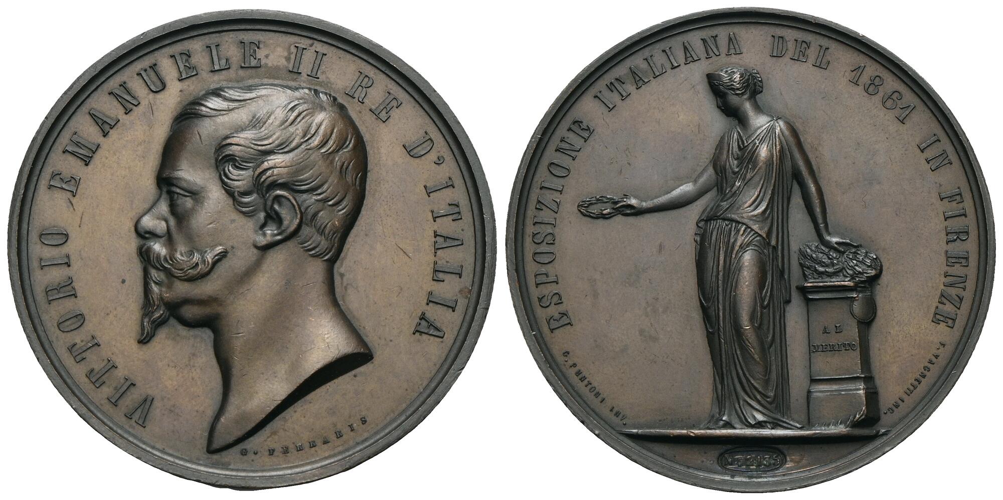 Vittorio Emanuele II: medaglia 1861 "Esposizione Italiana del 1861 in Firenze", opus Ferraris/Vagnetti/Puntoni (Wurzbach#9082), grammi 95.61, mm 55.50